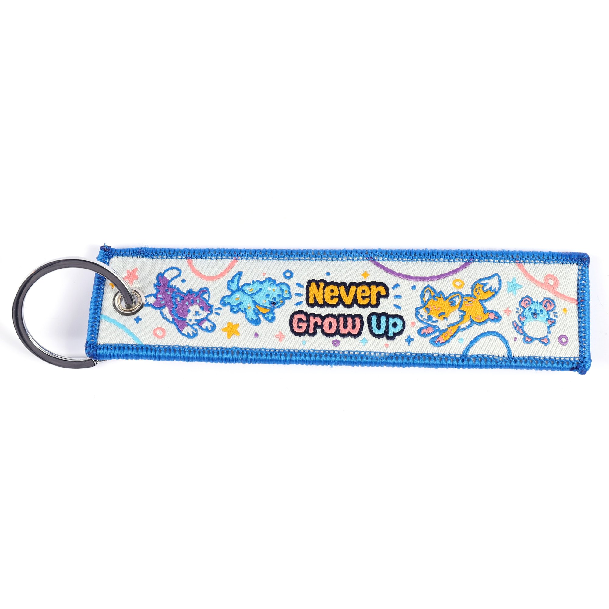 This embroidered keychain features the Kiddo Critters, framed with a deep blue border and fully embroidered details on both sides. It includes four playful animals, a cat, fox, dog, and mouse, each designed with a soft and nostalgic charm. Measuring about 13 cm wide and 3 cm tall, it makes a fun and eye-catching accessory for keys, bags, lanyards, or convention gear.