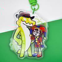 Pomni & Gumigoo Amazing Digital Circus Inspired Epoxy Charm Keychain is Professionally printed directly on durable glitter acrylic, double-sided, and comes with a green clasp. It measures roughly 3 inches in length. Great for keys, backpacks, lanyards, and more. Quality verified by fellow Gooseworx fans!