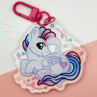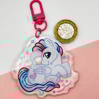 Night Glider Epoxy Charm Keychain is Professionally printed directly on durable glitter acrylic, double-sided, and comes with a pink clasp. It measures roughly 2.5 inches in length. Great for keys, backpacks, lanyards, and more. Quality verified by fellow My Little Pony fans!