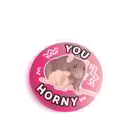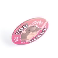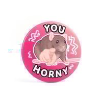 This tinplate button adds a touch of humor with its bold 'YOU HORNY' text! Perfect for those who enjoy a bit of cheeky fun, it’s an ideal addition to your backpack, jacket, hat, or lanyard. The button measures 58mm (2.3 inches) and features a matte textured finish that gives it a unique, high-quality feel. It's a great way to express yourself and spark a laugh wherever you go!